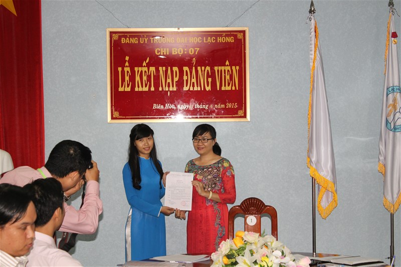 Căn cứ Quyết định của Đảng ủy khối các cơ quan tỉnh về việc kết nạp quần chúng Nguyễn Thị Hoài Vân và quần chúng Nguyễn Thế Hiển vào Đảng Cộng sản Việt Nam, được sự thống nhất của Ban Thường vụ Đảng ủy khối và Ban Thường vụ Đảng ủy trường, ngày 03 tháng 6 năm 2015 tại phòng họp CS1 trường Đại học Lạc Hồng, chi bộ 7 đã tiến hành tổ chức lễ kết nạp đảng viên cho quần chúng Nguyễn Thị Hoài Vân và quần chúng Nguyễn Thế Hiển vào Đảng Cộng sản Việt Nam; đến dự buổi lễ kết nạp có đồng chí Lê Sơn Quang – UV.BTV Đảng ủy trường cùng toàn thể đảng viên trong chi bộ 07.