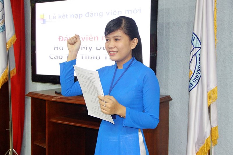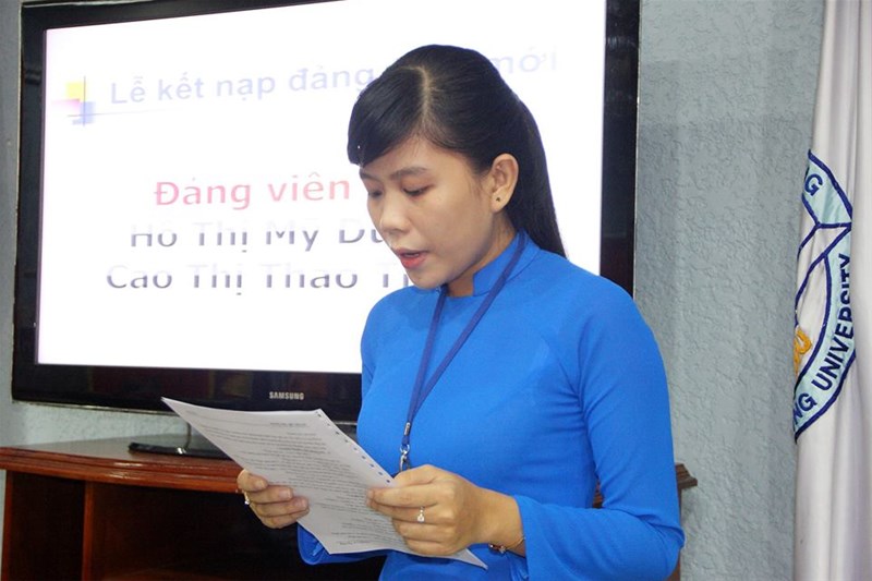 Hình 3: Đ/c Hồ Thị Mỹ Duyên đọc tuyên thệ tại buổi lễ kết nạp đảng viên