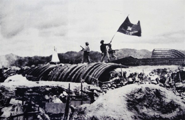 Hình 1: 17h30 ngày 7/5/1954, lá cờ "Quyết chiến quyết thắng" của Quân đội nhân dân Việt Nam tung bay trên nóc hầm của Tướng De Castries