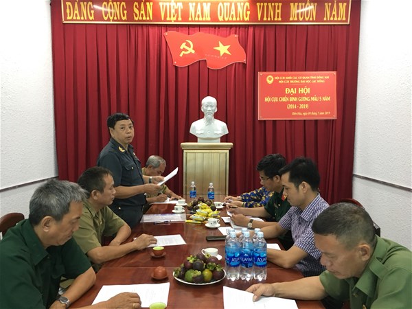 Ngày 04/7/2019, Hội Cựu chiến binh (CCB) trường Đại học Lạc Hồng tổ chức Đại hội thi đua "CCB gương mẫu 5 năm” giai đoạn 2014 - 2019 . Tham dự Đại hội có đồng chí Nguyễn Thanh Liêm- Phó Chủ tịch Hội CCB binh Khối; Đ/c Nguyễn Thị Thu Lan – Phó Bí thư Đảng ủy, Phó hiệu trưởng. Tham dự đại hội có 7 đồng chí trong Hội CCB trường, đại diện Đoàn Thanh niên, Hội Sinh viên trường.