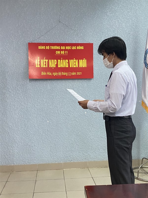 Được sự thống nhất của Ban thường vụ Đảng ủy khối, Đảng ủy trường ĐH Lạc Hồng, vào lúc 8h00 ngày 08 tháng 12 năm 2021 tại phòng họp cơ sở 1, Chi bộ 11 đã tiến hành tổ chức lễ kết nạp Đảng viên cho quần chúng Cao Văn Dư vào Đảng Cộng sản Việt Nam; Đến dự buổi lễ kết nạp có Đ/c Nguyễn Trùng Phương – Bí thư Đảng ủy trường cùng toàn thể Đảng viên trong Chi bộ.