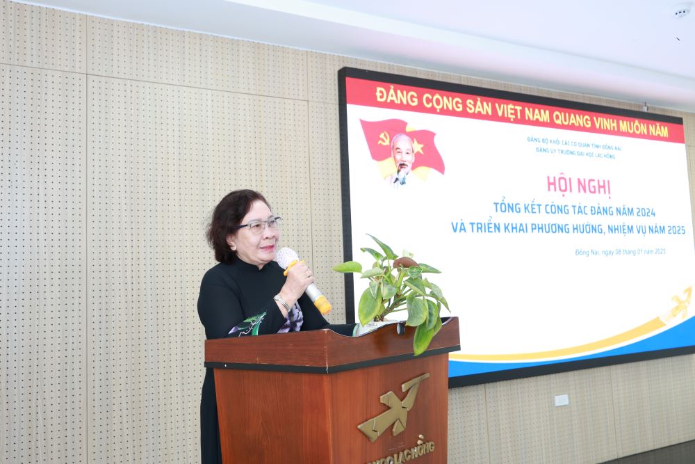 Đ/c Nguyễn Thị Thu Lan nhấn mạnh các nội dung trọng tâm trong năm 2024 và năm 2025. Đặc biệt thực hiện sự đoàn kết, thống nhất trong Đảng và trong toàn trường, tổ chức tốt công tác giáo dục chính trị tư tưởng, tăng cường công tác tự phê bình và phê bình trong Đảng, Đảng bộ trường triển khai thực hiện nghiêm túc các công tác này, đặc biệt là triển khai thực hiện việc Học tập chuyên đề học tập và làm theo tư tưởng, đạo đức, phong cách Hồ Chí Minh trong trường.