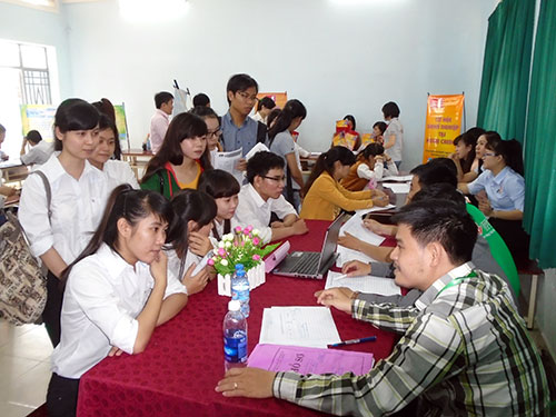 Tại ngày hội lần này, Ban tổ chức đã bố trí ba phòng học khá rộng làm nơi để các doanh nghiệp đặt bàn tuyển dụng nhưng dường như vẫn không đủ chỗ cho sinh viên tìm hiểu, trao đổi thông tin về việc làm. Phan Diệu Huệ, sinh viên ngành Tài chính ngân hàng chia sẻ: “Mình đang viết đơn dự tuyển vào Ngân hàng Việt Á. Sáng nay có 2 ngân hàng tham gia tuyển dụng, đây là cơ hội cho mình…”.