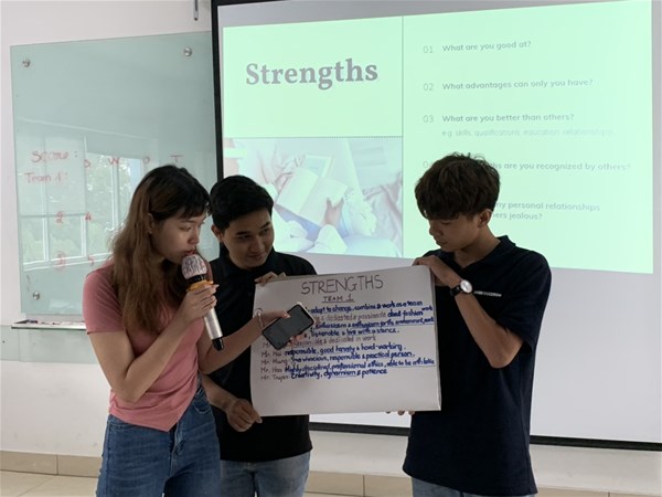 Club activities with the theme: “What is your SWOT answer?” attracted a large number of students from Faculty of Finance - Accounting to attend. With the guidance of Ms. Tran Thi Phuong Thao (lecturer of FFA), Miss Dinh Nguyen Tuong An, Mr. Nguyen Huu Thien from the Faculty of English Language, students learned the basics of SWOT, so students found out their strengths, weaknesses, and opportunities, and threats.