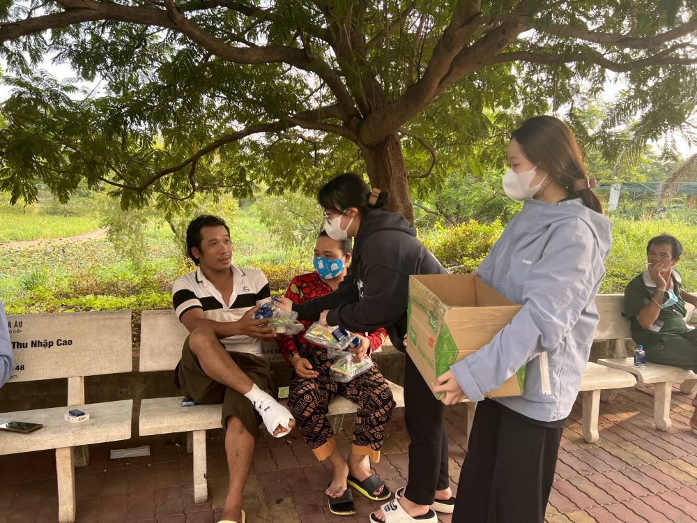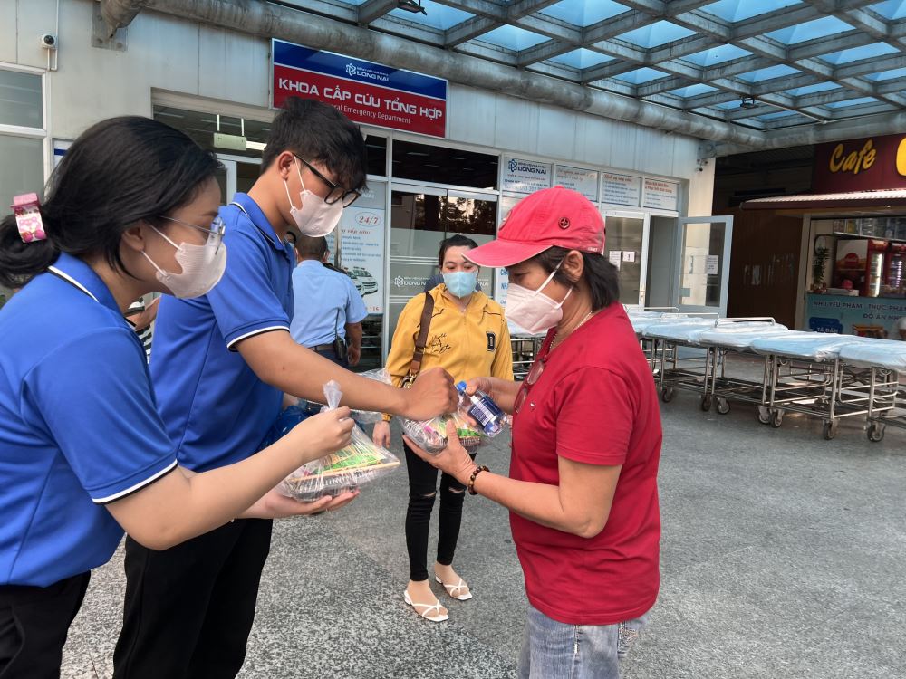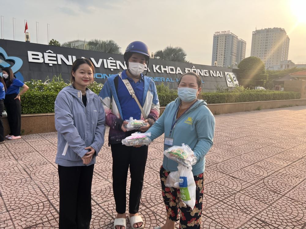 After completing 80 servings of food including rice rolls, water and milk. The team members hand-carried it to Dong Nai General Hospital and carried out their tasks. Looking at the radiant faces of the patients and uncles when receiving the meals, the students in the group all felt happy and proud of this meaningful little act.