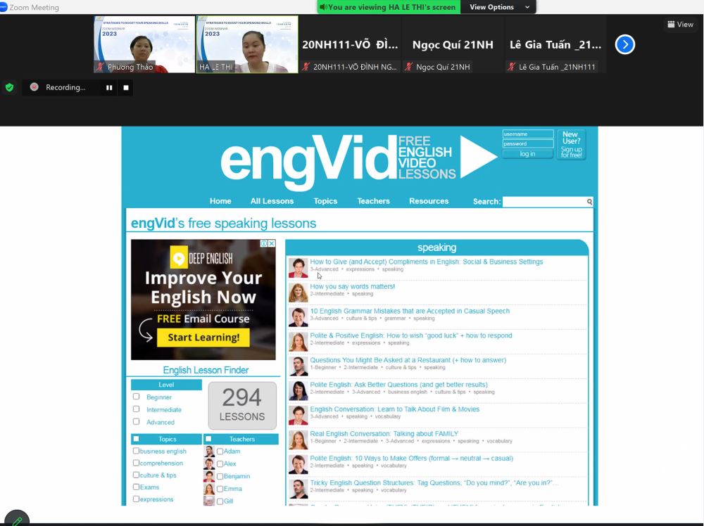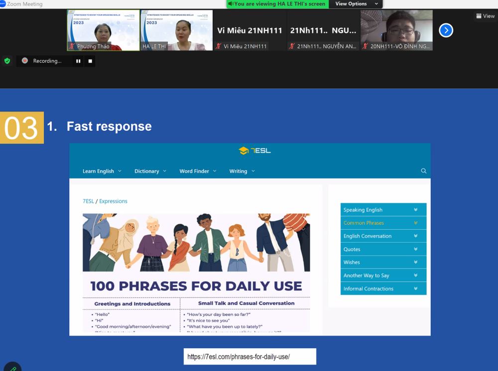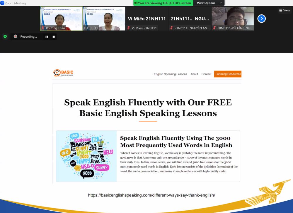 On June 22, 2023, the English Club of the Faculty of Finance and Accounting successfully organized an online activity via a webinar with the theme "How to Boost Your Speaking English Skill." This workshop attracted the attention and participation of many club members, as well as English enthusiasts who desired to improve their communication skills.
