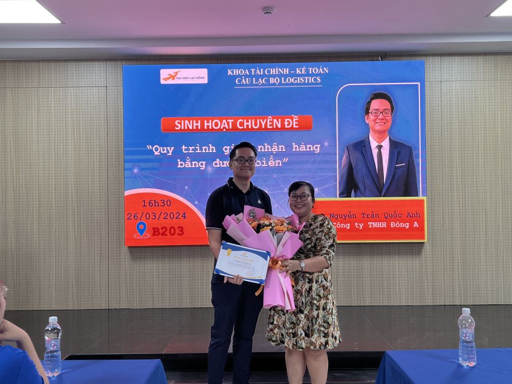 On the afternoon of March 26, 2024, in room B203, Building 1, Lac Hong University, the Logistics Club held its third regular meeting with the theme "Sea Freight Handling Process," featuring guest speaker Mr. Nguyen Tran Quoc Anh, Deputy Director of Dong A Co., Ltd. The event saw enthusiastic participation from 200 students majoring in Logistics and Supply Chain Management.