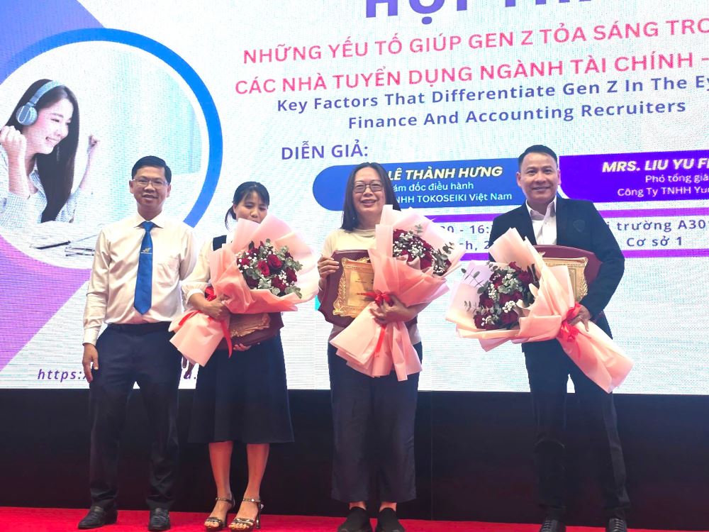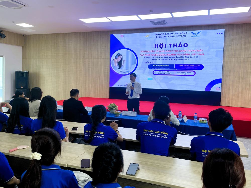 To equip students with the essential knowledge and skills to meet the increasing demands of the labor market, on the afternoon of March 10, 2025, the Faculty of Finance and Accounting at Lac Hong University organized a seminar on the topic "Factors Helping Gen Z Shine in the Eyes of Recruiters in the Finance – Accounting Industry." The event attracted the interest of many students and featured two speakers with years of experience in financial and accounting management: Mr. Le Thanh Hung, CEO of TOKOSEIKI Vietnam Co., Ltd., and Mrs. Liu Yu Feng (Jay), Deputy General Director of Yuoyi Vietnam Co., Ltd.