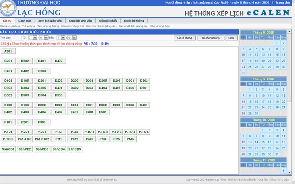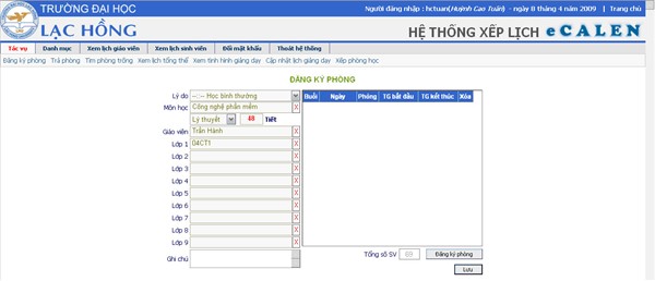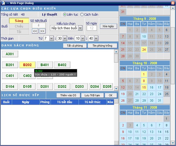 Sau khi chọn thông tin cần xếp lịch như : môn học, giáo viên, lớp (có thể chọn nhiều lớp nếu trường hợp môn đó học lớp ghép) ta click vào nút đăng ký phòng nó sẽ xuất hiện hộp thoại cho ta chọn ngày và phòng.
