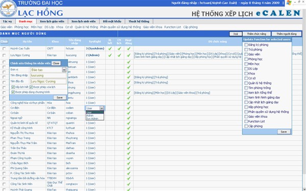 Để thêm chức năng sử dụng hệ thống của người dùng ta check vào người đó và bấm vào nút Thêm chức năng sau đó chọn chức năng phù hợp và click nút Save