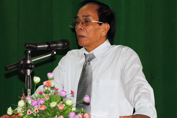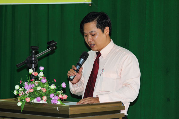 MA Nguyen Ba Thuan makes a report on Robocon achievements at the ceremony.
