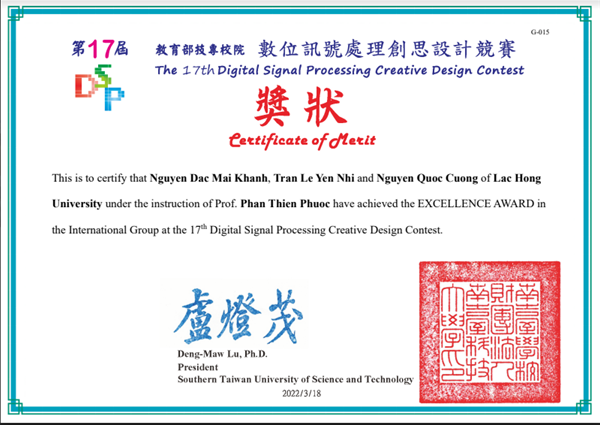 Three students including Nguyen Dac Mai Khanh, Tran Le Yen Nhi and Nguyen Quoc Cuong from Faculty of Information Technology, Faculty of English Language and Faculty of Mechatronics - Electronics, LHU on March 18 won the Excellence Award at the 17th Digital Signal Processing Creative Design Contest held by Southern Taiwan University of Science and Technology in coordination with Taiwan Ministry of Education.
