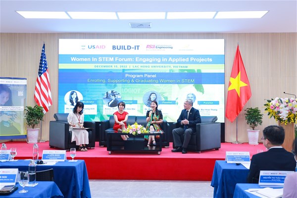 The Forum agenda also included the panel session "Enrolling, Supporting & Graduating Women in STEM" including Moderator Ms. Dang Tran Phuong Anh, Country Director, ASU Vietnam and Panelists namely Assoc. Prof. Dr. Dam Sao Mai, Vice Rector, Industrial University of HCM City; Dr. Bui Thi Ngan, Deputy Director, Board of Project Management, Ha Noi University of Industry and Assoc. Prof. Dr. Bui Hoai Thang, Head of Academic Affairs Office, HCM City of Technology. Here, the participants listened to experts in the field on how to enroll, support and graduate more women in STEM as well as their strategies to engage and provide more opportunities for women to succeed in these fields.