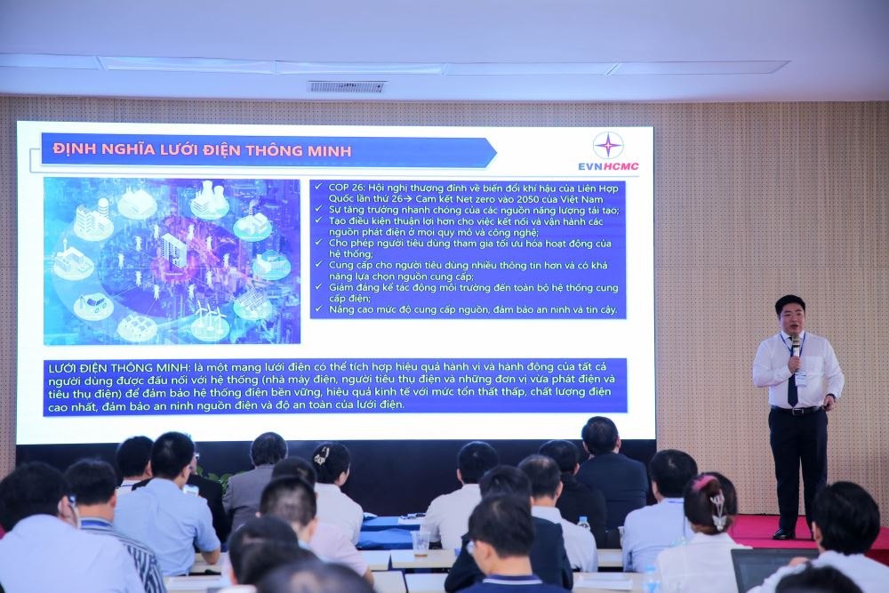 Dr. Luan Quoc Hung - Vice General Director of HCM City Electricity Company presented the report "Smart Grid, outstanding results in 2022 and applications of power electronics in smart grid development"