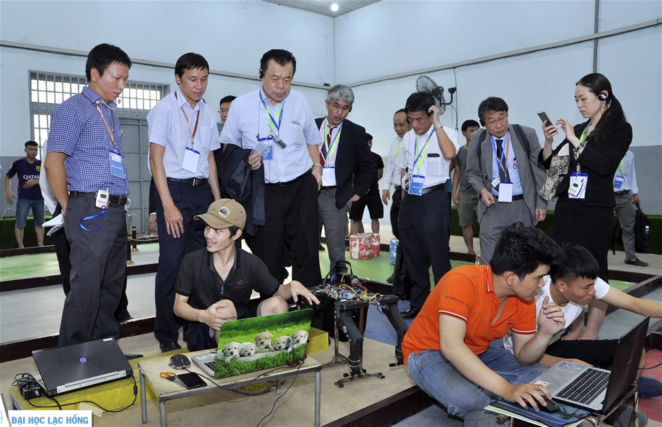 • DSc. Le Hoang Anh - Vice Dean of Faculty of Mechatronics and Electronics (2nd, left) introducing robot creation activities to the delegation of Kinki University (Japan)