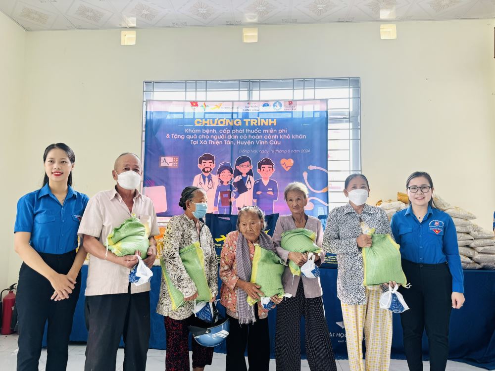 On August 18, 2024, LHU's Youth Union - Student Association coordinated with Long Chau Pharmacy, Vinh Cuu district Young Doctors' Club and Thien Tan commune's Youth Union to organize a program of free medical examination, medicine distribution and gift giving for 100 households in difficult circumstances in hamlet 6 and 7, Thien Tan commune, Vinh Cuu district.