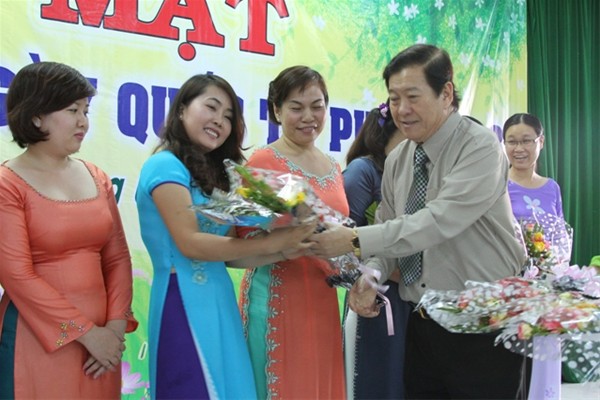Thầy Đỗ Hữu Tài tặng hoa cho Ban nữ công và nữ đại diện chi đoàn cơ quan