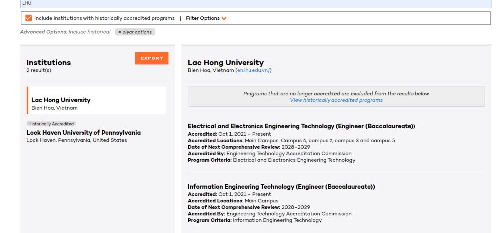 On October 18, 2023, ABET (Accreditation Board for Engineering and Technology) announced the accreditation results that the two undergraduate training programs of LHU - Electrical and Electronics Engineering Technology and Information Engineering Technology were recognized to meet ABET standards in a 6-year period. This recognition is a milestone in the LHU’s history, ensuring educational quality and international recognition for engineers who enroll in these programmes.