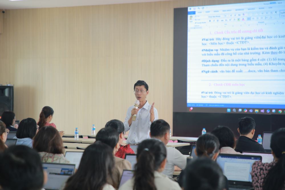 In addition to theoretical discussions, Dr. Le Phuong Truong and Mr. Nguyen Trong Vinh worked closely with faculty members, guiding them through practical applications of AI tools to refine course syllabi in alignment with learning outcomes.