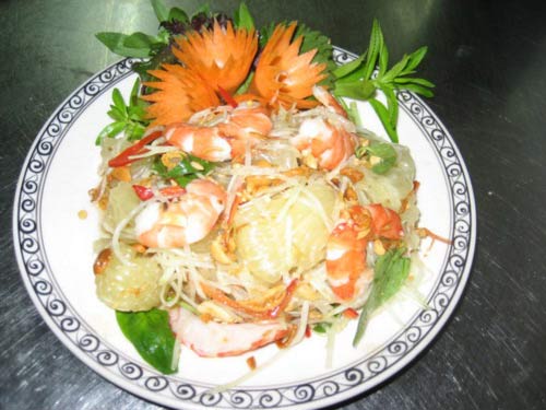 Bien Hoa’s people also create many special dishes from pomelos like goi buoi, pomelo juice, and pomelo wine, pomelo sweet soup, pomelo roll… In particular, goi buoi is famously delicious because all ingredients are home-grown, simple and easy to find. People use Thanh pomelos (little water, crisp, sour and slightly sweet) to make goi buoi (pomelos mixed with shrimp caught from Dong Nai river, rau thom (kinds of vegetables that have smell), ground peanuts, pork meat, carrot, pepper, sugar, fish sauce, garlic, chili,…). People can enjoy goi buoi with young pomelo leaves, baked girdle cakes, bringing their appetite due to light sour, sweet, spicy, and buttery tastes of all ingredients.