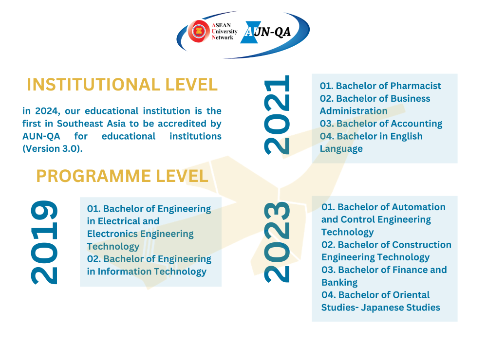 Lac Hong University's unwavering commitment to quality education is exemplified by the 14 study programs that have achieved AUN-QA certification between 2019 and 2023. Our university takes immense pride in this accomplishment, which underscores our dedication to maintaining the highest standards in education. These include: