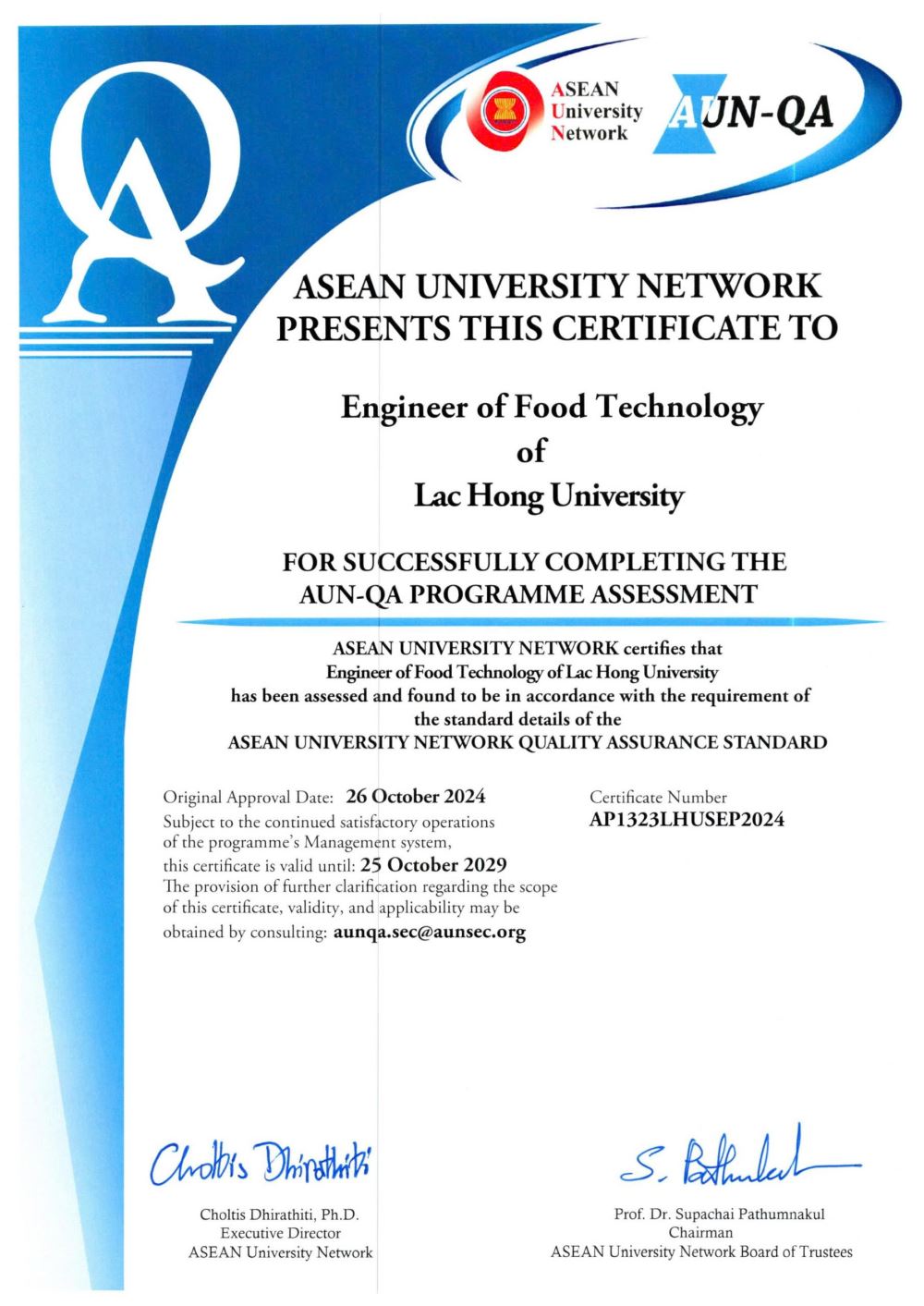 These programs were assessed and certified on 26 October 2024, with the certificate valid until 25 October 2029. The AUN-QA certification ensures that these programs meet the rigorous standards required for academic excellence, professional relevance, and global competitiveness.