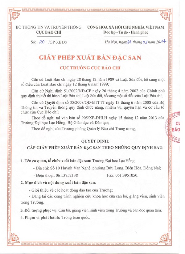 Căn cứ vào quy hoạch báo chí đã được Thủ tướng Chính phủ phê duyệt, theo văn bản đề nghị của Trường Đại học Lạc Hồng, Bộ Giáo dục và Đào tạo, ngày 21 tháng 01 năm 2014, Cục Trưởng Cục Báo Chí đã ra Quyết định số 20/GP-XBĐS, cấp giấy phép xuất bản đặc san “Khoa học Lạc Hồng”.