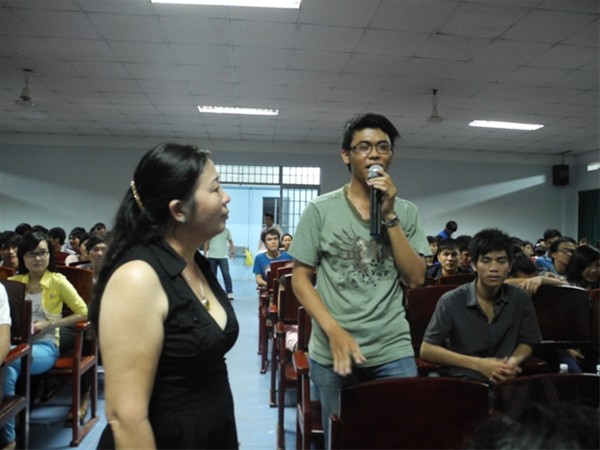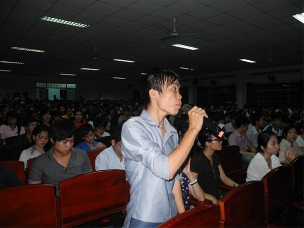 Sau những phút ban đầu e dè, ngại ngùng với những câu hỏi dạng “thư tay” thì đã có không ít bạn sinh viên mạnh dạn đứng lên trao đổi trực tiếp cùng chuyên gia.