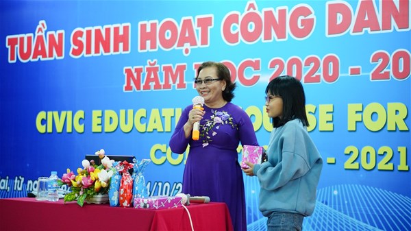 NGƯT.TS Nguyễn Thị Thu Lan – Phó Bí thư Đảng ủy - Phó Hiệu trưởng Nhà trường khen thưởng cho các sinh viên có câu trả lời xuất sắc trong buổi học