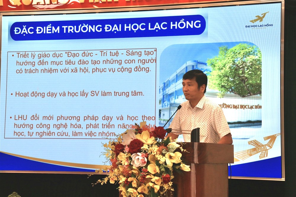 PGS. TS Nguyễn Vũ Quỳnh-Phó Hiệu trưởng đại diện trường và trình bày tham luận về công tác huy động đối tượng tham gia xã hội hóa giáo dục và công tác phát triển ngành nghề và việc đóng góp của LHU đối với nguồn nhân lực của tỉnh nhà.