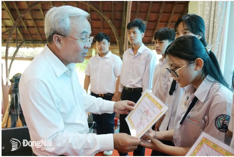 Ủy viên Ban TVTU, Chủ tịch Ủy ban MTTQ Việt Nam tỉnh Cao Văn Quang trao học bổng cho học sinh, sinh viên