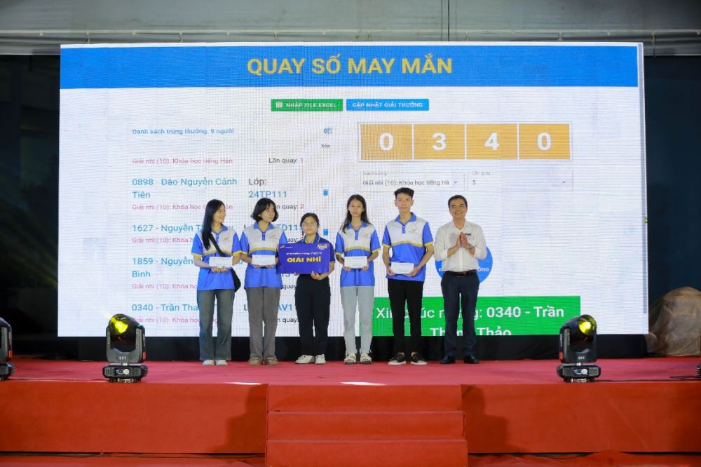 Một trong những phần được mong chờ nhất trong sự kiện chính là chương trình rút thăm trúng thưởng. Những phần quà giá trị như Laptop Asus Vivobook, tai nghe AirPods, và các suất học bổng tiếng Hàn đã khiến cho cả sân khấu bùng nổ. Niềm vui rạng rỡ trên gương mặt của những người may mắn trúng thưởng đã làm ngày hội kết thúc trong niềm hân hoan và phấn khởi.