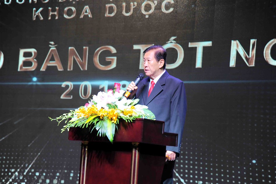 NGND.TS Đỗ Hữu Tài phát biểu tổng kết 5 năm khoa Dược và trao hoa chúc mừng Ban Lãnh đạo Khoa Dược
