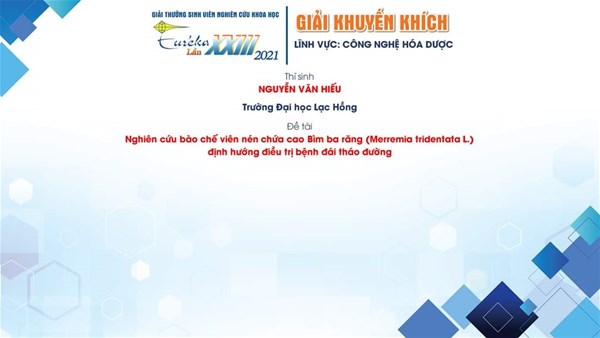Với đề tài có tính ứng dụng cao: Nghiên cứu bào chế viên nén chứa cao Bìm ba răng (Merremia tridentata L.) định hướng điều trị bệnh đái tháo đường. Được sự hướng dẫn của thầy Võ Văn Lệnh và thầy Nguyễn Việt Cường.