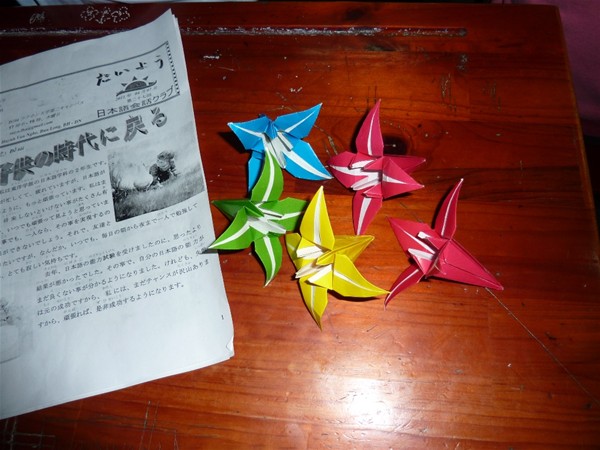 皆は一緒に紙で百合という花の形を楽しく折った