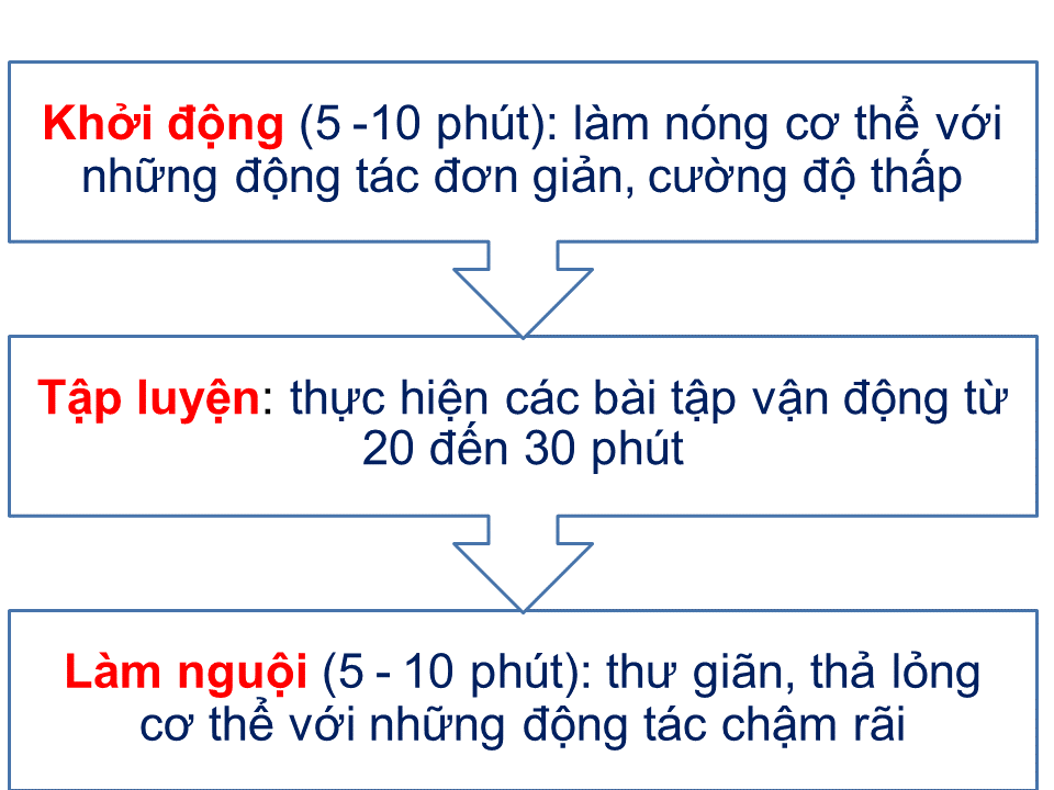 Nên thực hiện các bài tập cường độ trung bình ít nhất 150 phút mỗi tuần, 3 đến 5 lần một tuần, bắt đầu bằng bài tập cường độ thấp, tăng dần cường độ và số lượng tập thể dục theo mức độ thể dục cá nhân.