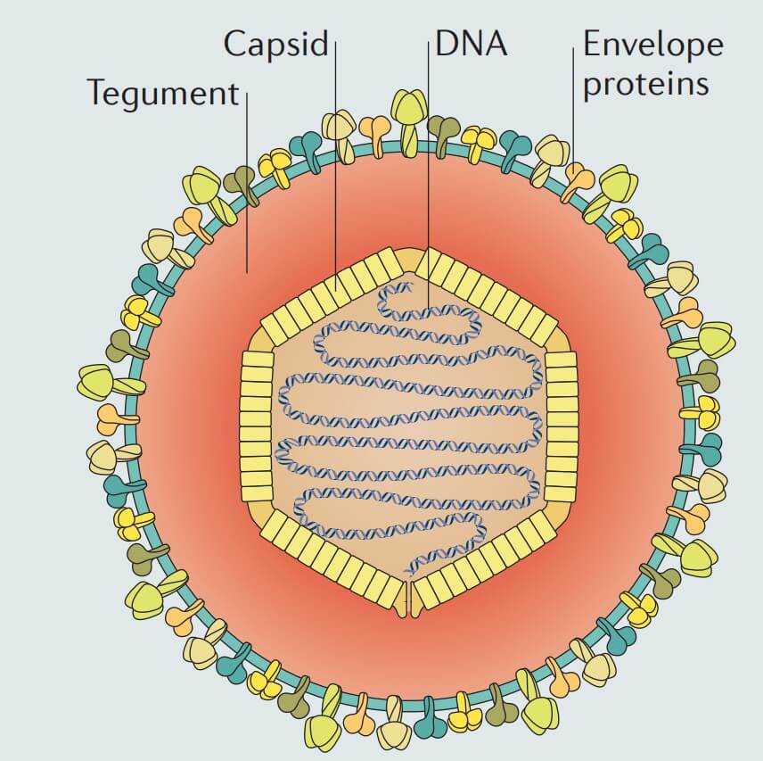Tương đồng với các virus herpes khác và bao gồm bốn phần chính: