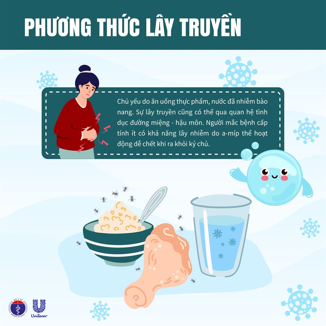 Bệnh được lây truyền qua đường phân – miệng, do thức ăn hoặc nước uống bị nhiễm từ phân của người nhiễm amip ở đường ruột.