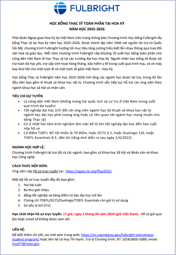 Phái đoàn Ngoại giao Hoa Kỳ tại Việt Nam trân trọng thông báo Chương trình Học bổng Fulbright lấy bằngThạc sỹ tại Hoa Kỳ năm học 2025‐2026. Được thành lập năm 1946 với nguồn tài trợ từ Quốc hội Mỹ, chương trình Fulbright hướng tới mục tiêu tăng cường hiểu biết lẫn nhau thông qua trao đổi văn hoá và giáo dục. Mỗi năm chương trình Fulbright cấp khoảng 20 suất học bổng toàn phần cho công dân Việt Nam đi họcThạc sỹ tại các trường đại học Hoa Kỳ. Người nhận học bổng sẽ được tài trợ toàn bộ học phí, trợ cấp sinh hoạt hàng tháng, bảo hiểm y tế trong suốt quá trình học, và vé máy bay khứ hồi cho một lượt đi và một lượt về giữa Việt Nam ‐ Hoa Kỳ.