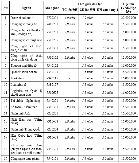 Lưu ý: Học phí không thay đổi trong suốt quá trình học, một năm gồm 2 học kỳ.