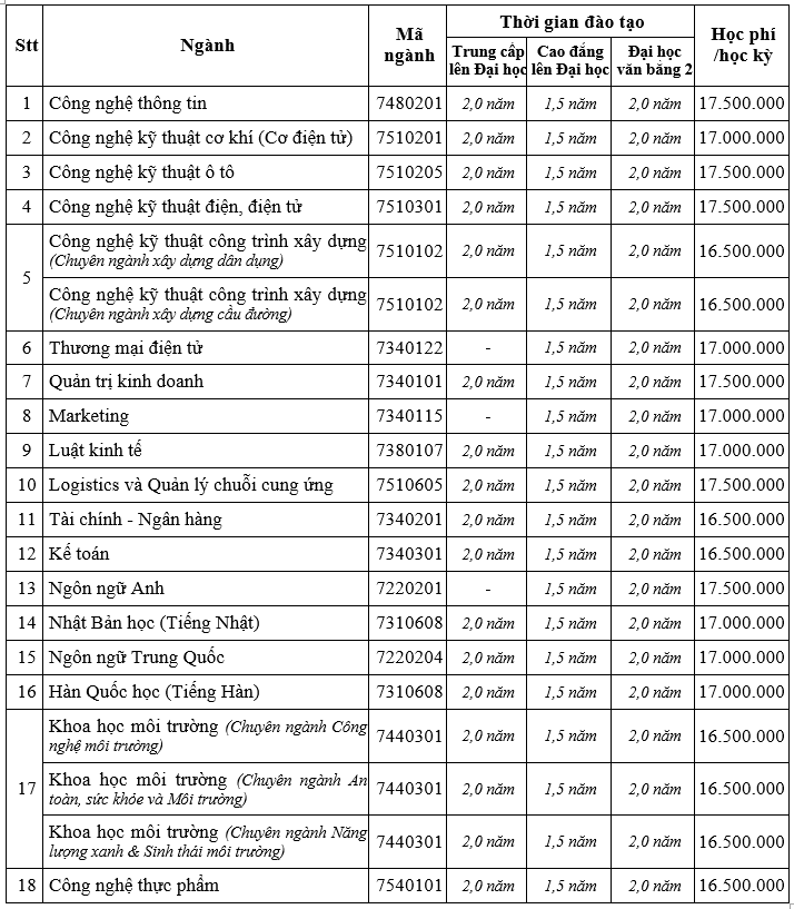 Lưu ý: Học phí không thay đổi trong suốt quá trình học, một năm gồm 2 học kỳ.