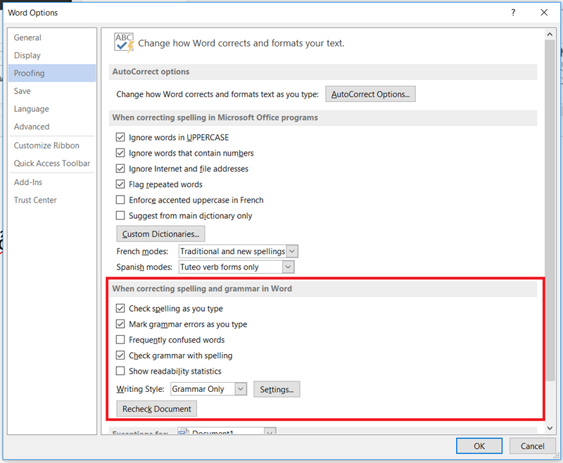 Bước 2: Tại cửa sổ Word Options, chọn chức năng Proofing, sau đó tại nhóm chức năng "When correcting spelling and grammar in word", bạn bỏ chọn 2 chức năng: