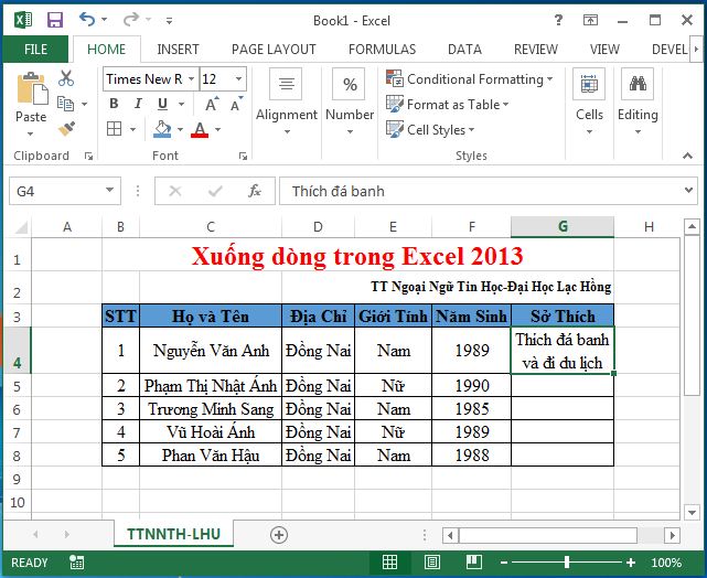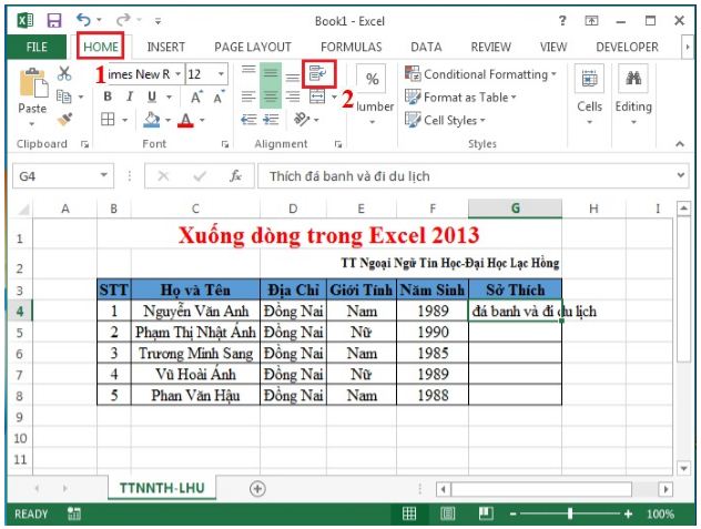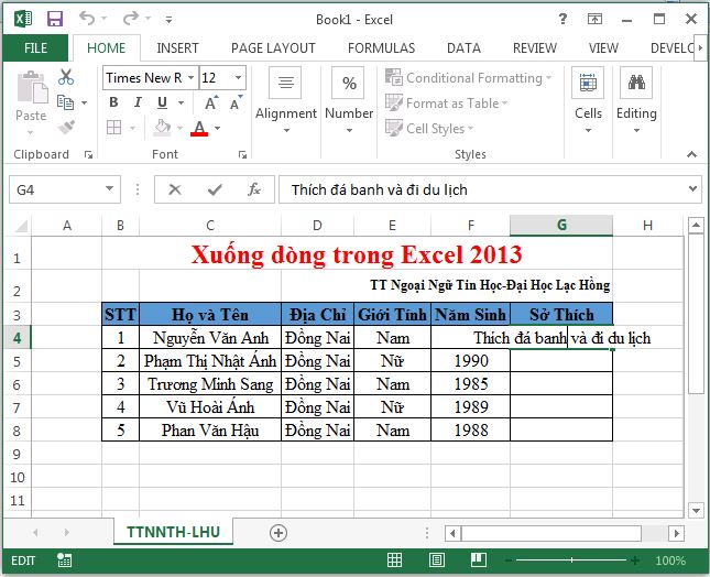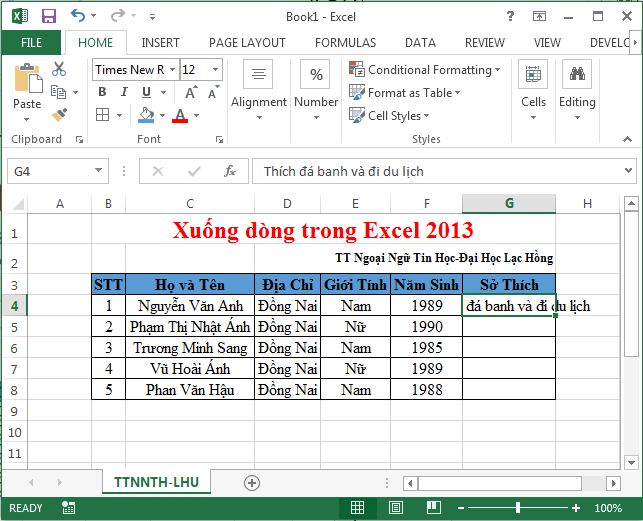 Trong quá trình nhập dữ liệu trên Excel 2013, chắc hẳn sẽ có nhiều người dùng gặp phải trường hợp khi gõ văn bản, do đoạn văn bản quá dài khiến chúng bị tràn và lấn sang các ô dữ liệu khác. Vì thế mà các bạn muốn xuống dòng trong Excel để dữ liệu hiển thị đầy đủ trong một ô. Tuy nhiên không phải ai cũng biết thực hiện thủ thuật đơn giản này và nhất là người dùng mới. Do đó mà bài viết ngay sau đây, Trung Tâm Ngoại Ngữ Tin Học - Đại Học Lạc Hồng sẽ hướng dẫn các bạn cách xuống dòng trong Excel 2013 cũng như áp dụng được với hầu hết các phiên bản Excel hiện nay như Excel 2016, 2010, 2007, 2003.