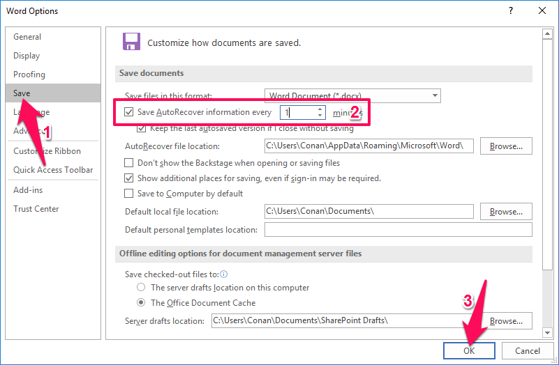 Bước 2: Chọn phần Save trong menu bên trái. Sau đó nhìn sang bên phải, thay đổi thời gian trong phần Save AutoRecover information every . Thời gian tự động lưu ở đây được tính bằng phút (minutes). Nhỏ nhất bạn có thể đặt là 1 phút thôi.