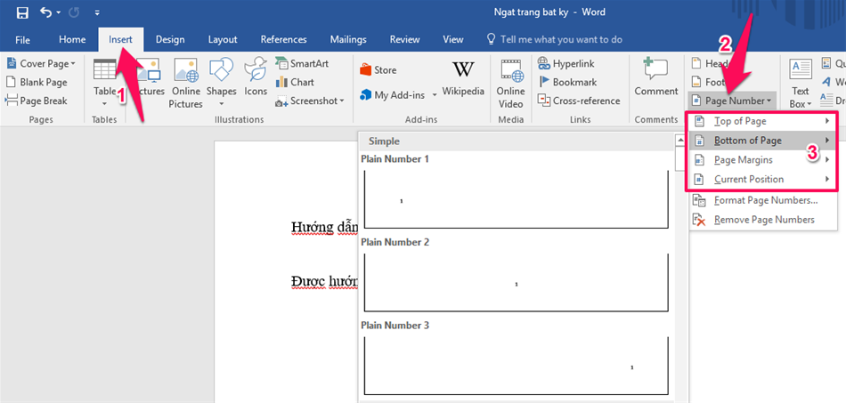 Bạn có thể thêm đánh số trang ngay bằng cách lựa chọn các vị trí hiển thị số trang như đánh dấu trong hình trong đó: