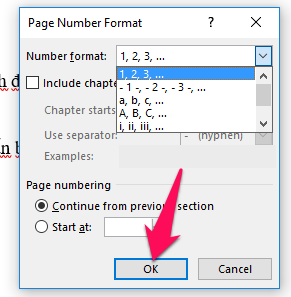 Chọn định dạng dùng để đánh số trang trong phần Number format .