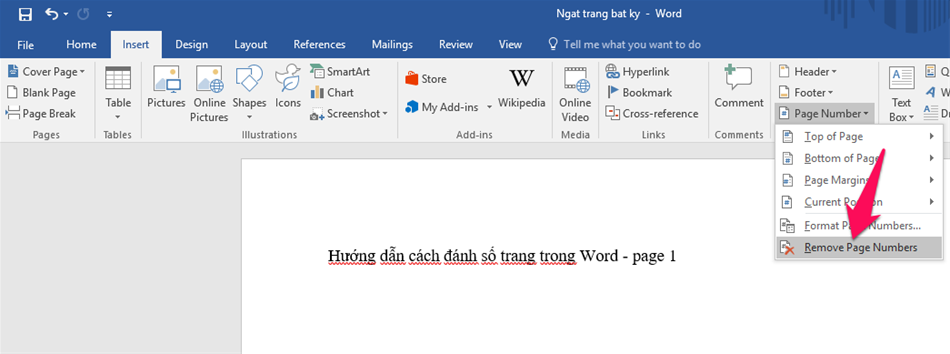 Để xóa đánh số trang, bạn nhấn nút Remove Page Numbers (vẫn trong phần Insert -> Page Number).