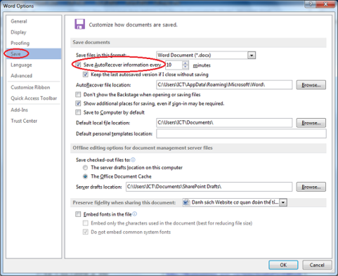 Nếu bạn làm việc trong môi trường không an toàn vì điện áp thì hiện tượng treo máy hoặc tự khởi động lại đột ngột là điều khó có thể tránh khỏi, để an toàn hơn cho công việc soạn thảo văn bản của mình bạn nên thiết lập thời gian tự động “lưu trữ” dữ liệu với cách thực hiện như sau: