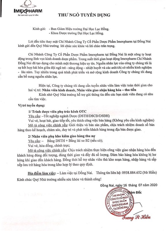 With the desire to develop and expand the market, this company sent an open letter to bring opportunities for pharmacists graduated from the Faculty of Pharmacy at Lac Hong university.