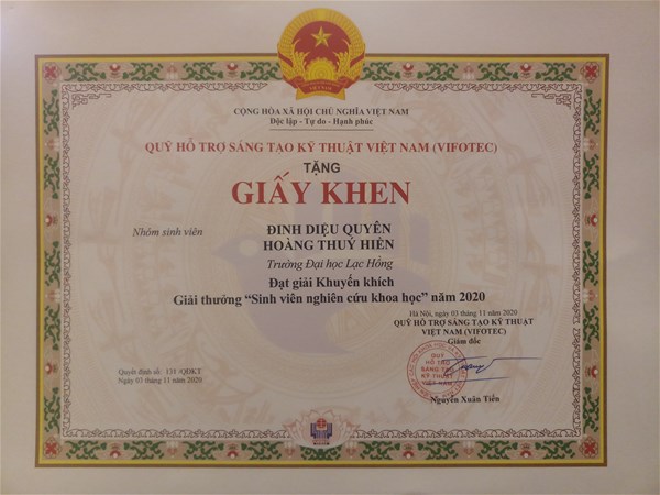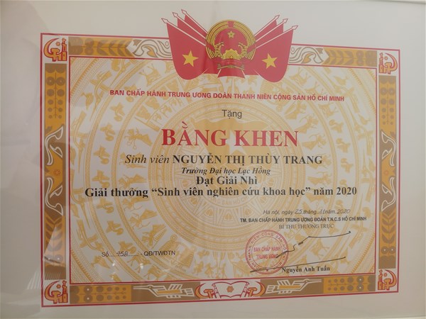 Hình 2: Bằng khen đạt giải Nhì Giải thưởng "Sinh viên nghiên cứu khoa học" cấp Bộ năm 2020